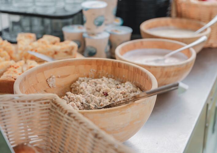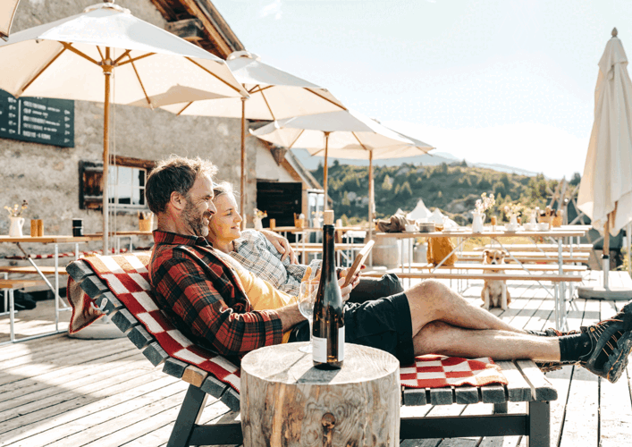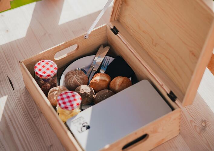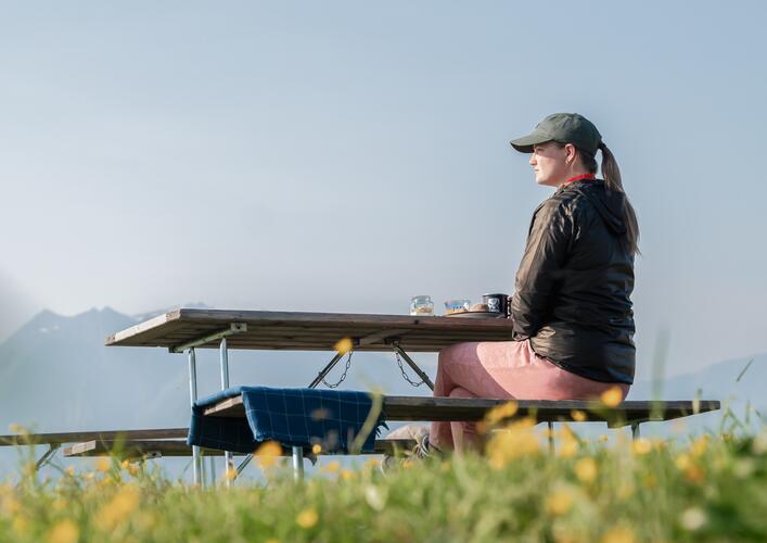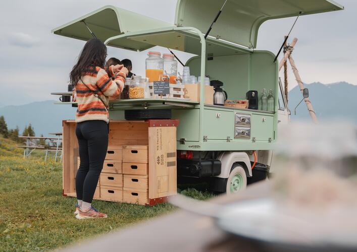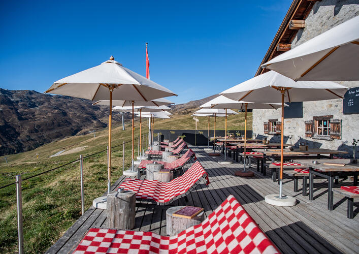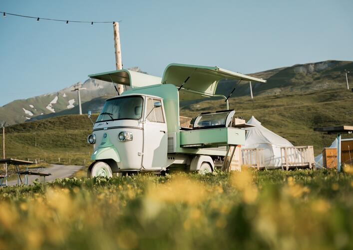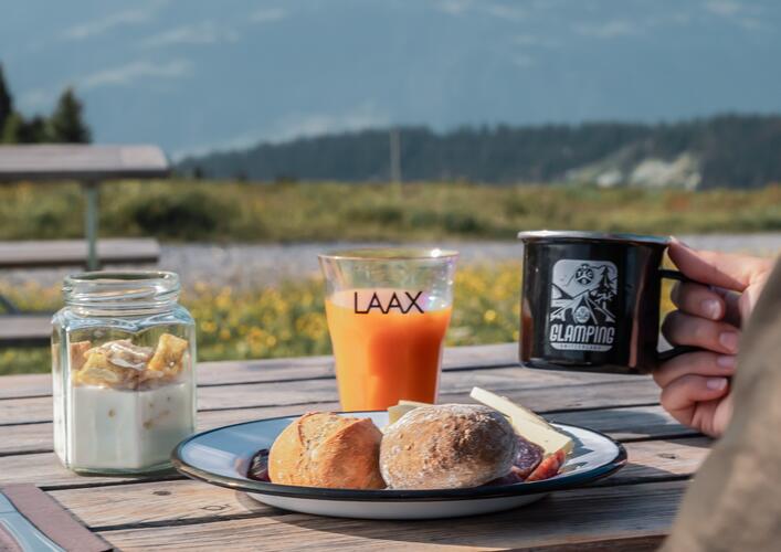 The morning begins with breakfast. You can put together your individual breakfast box at the TukTuk buffet and enjoy breakfast in your tent or on your tent terrace. In the evening the guests are spoiled with a menu of regional products in the restaurant Stalla www.stalla-alpnagens.ch. Those who are looking for togetherness can stock up on drinks in the restaurant and end the evening on their own terrace by candlelight.