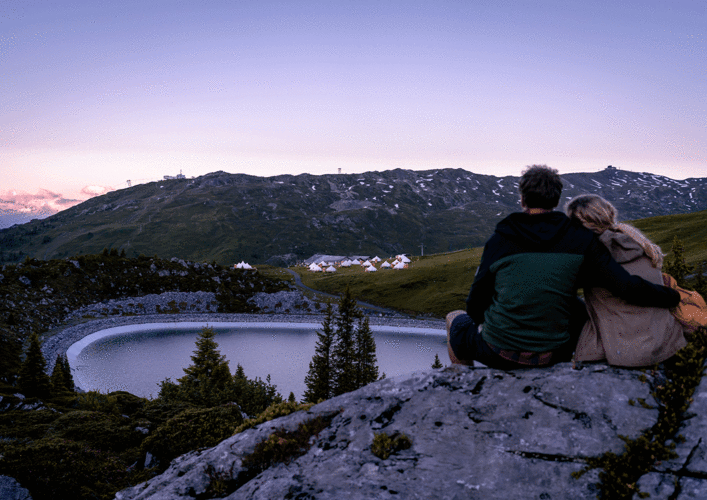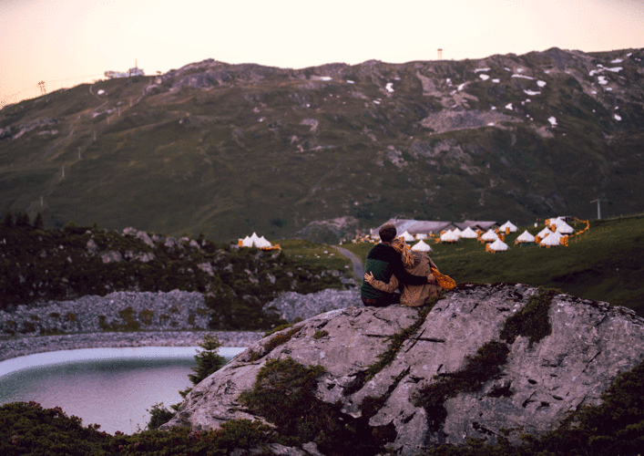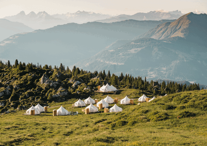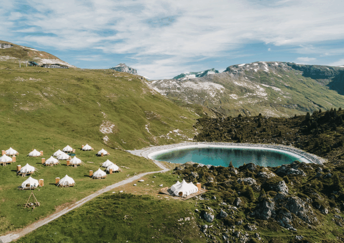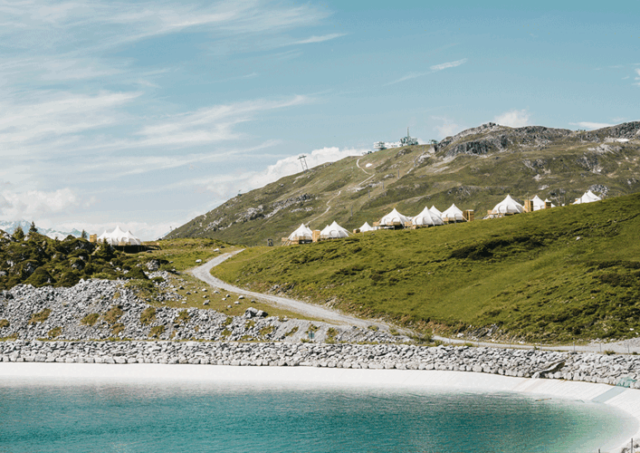 The pop-up village now consists of 20 dignified tent units, which are located either directly on the reservoir or on a hill, and an enchanting Mahal tent suite. Urbanites, families, connoisseurs and romantics enjoy an exclusive, high alpine nature experience paired with living comfort, regional delicacies and excellent wine.